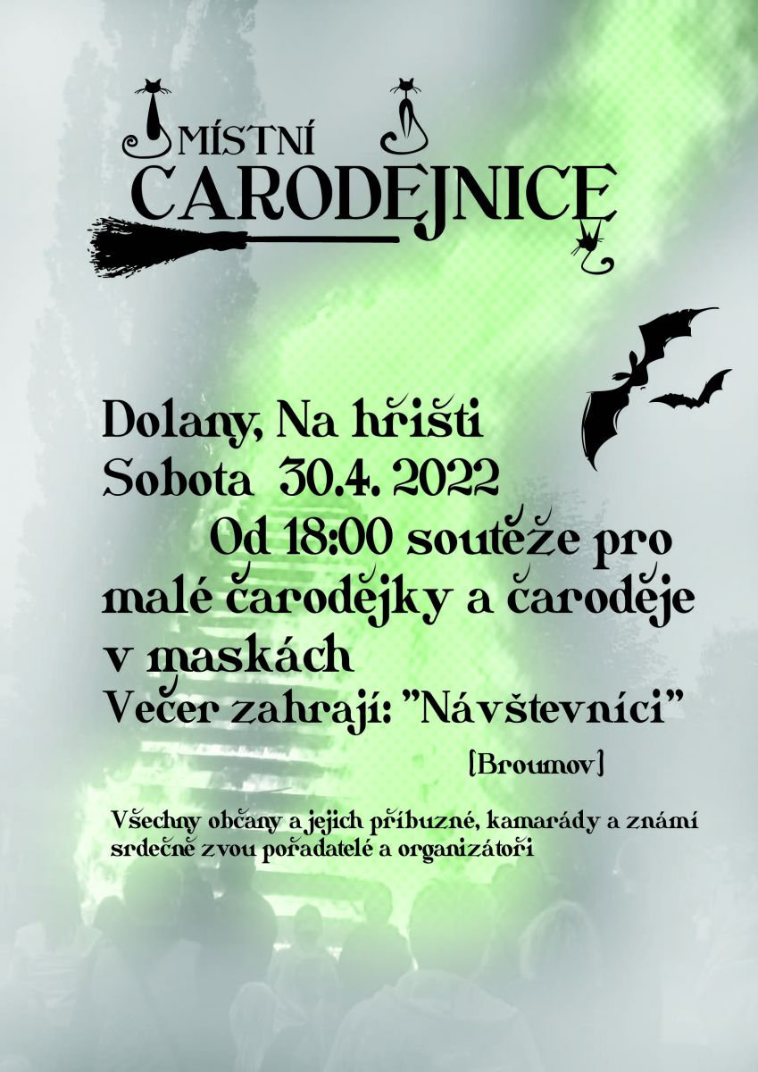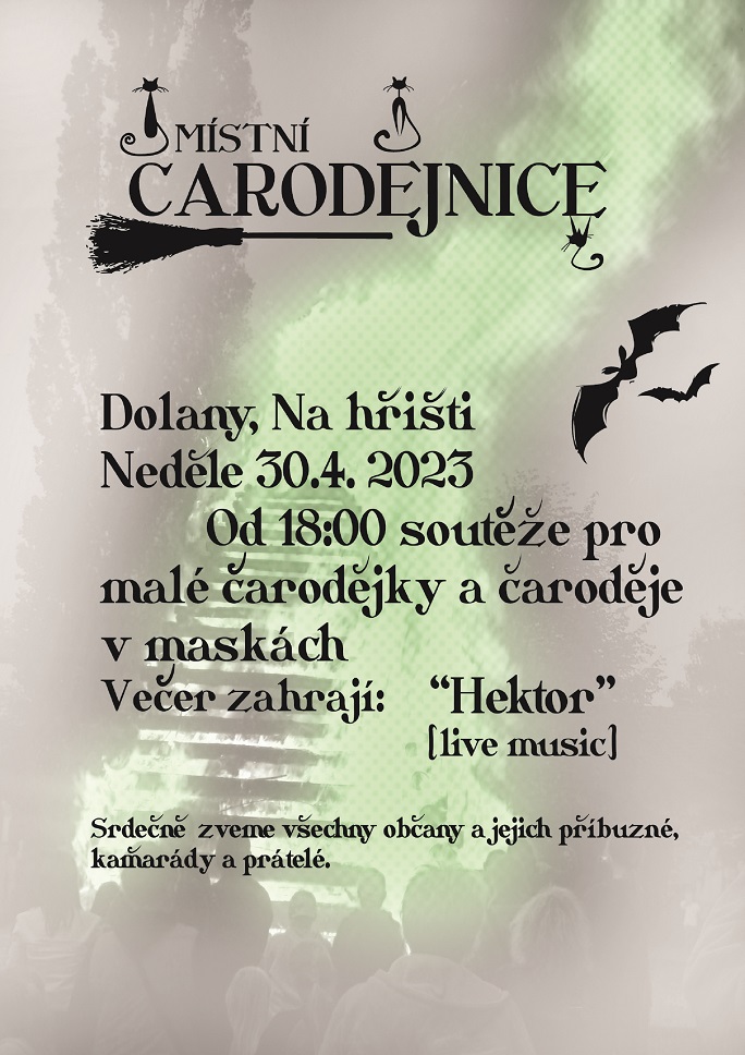 Večer nám zahrají: hudební skupina – Hektor.Tak ať se omladina ustrojí do svátečního čarodějnického hábitu, vezme s sebou rodiče a přijde pobejt.