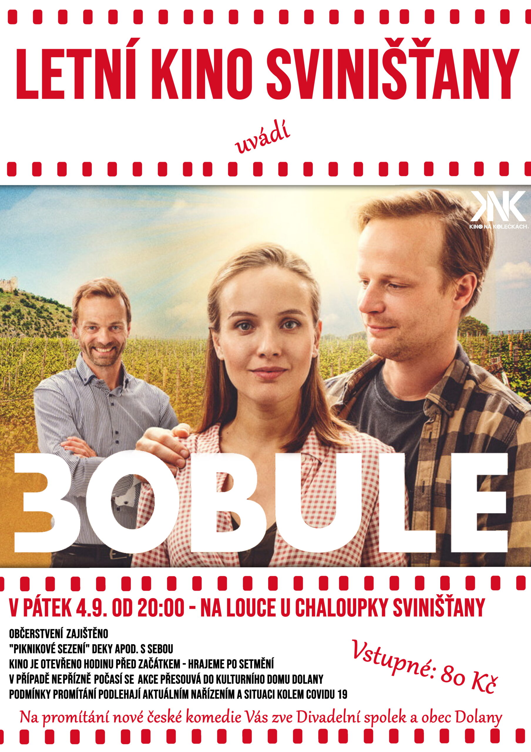 Kino otevřeno hodinu před promítáním – hrajeme po setmění. “Piknikové sezení” – deky apod. s sebou. V případě nepřízně počasí se akce přesouvá do kulturního domu Dolany. Občerstvení zajištěno – popcorn, pivo, limo, víno -